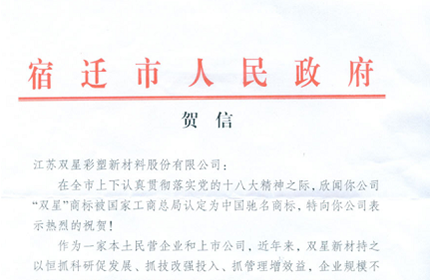 12年8月23日,由江蘇省品牌學(xué)會(huì)、宿遷市工商聯(lián)、宿遷工商行政管理局及宿遷市廣播電視總臺(tái)(集團(tuán))聯(lián)合共同舉辦的“2012首屆中國(guó)?宿遷品牌文化節(jié)”,公司“雙星”品牌被評(píng)為“宿遷市城市推動(dòng)力十大最具影響力品牌”。